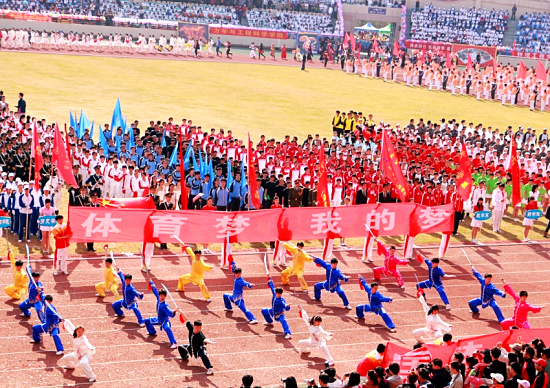 4月10日上午8:30,郑州大学2013年“阳光体育运动”田径运动会开幕式在新落成的田径场如期举行,我院巫兰英院长作为主席团成员参加开幕式,并在主席台前排就座。在开幕式入场式上,我院武术与民族传统体育系学生献上武术套路表演,博得了现场观众的满堂喝彩和掌声;运动系学生组成的方块队,在经过主席台时,变换成“中国梦强国梦”、“ 体育梦 我的梦”字样的队形;两支队伍的表演,表达了我院师生的美好愿望,展示了体院......