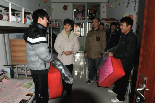 12月11日上午,我院院长巫兰英、副院长杨国安、纪委书记郑焕民、学生处处长曹兵来登封校区慰问贫困生。巫院长、杨院长、郑书记一行在校区领导陪同下到学生宿舍看望慰问同学们,并为家庭困难的学生发放棉衣棉被。巫院长代表学院向同学们表示亲切的慰问,并勉励家庭困难同学们要勇于面对困难,自立自强,同时学院也会尽力帮助家庭经济条件困难的同学完成学业。 巫院长指出本次“关爱贫困生,寒冬送温暖”慰问......