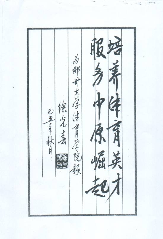 省委书记、省人大常委会主任徐光春同志为我院题词 在全国上下喜迎祖国六十华诞、欢庆双节之际,河南省委书记、省人大常委会主任徐光春同志欣然为我院题词:“培养体育英才,服务中原崛起”,题词充分体现了省领导对学院发展的亲切关怀和殷切希望,更为我院今后进一步发展指明了方向和目标,使全院师生既感到光荣,更感到任重道远。...