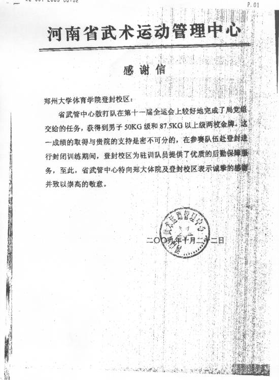 河南省武术运动管理中心致信感谢我院登封校区 河南省散打队在第十一届全运会上为我省体育代表团争得两枚金牌,我院登封校区此前承担了省男女散打队共计70余人赛前近60天的封闭训练任务。...