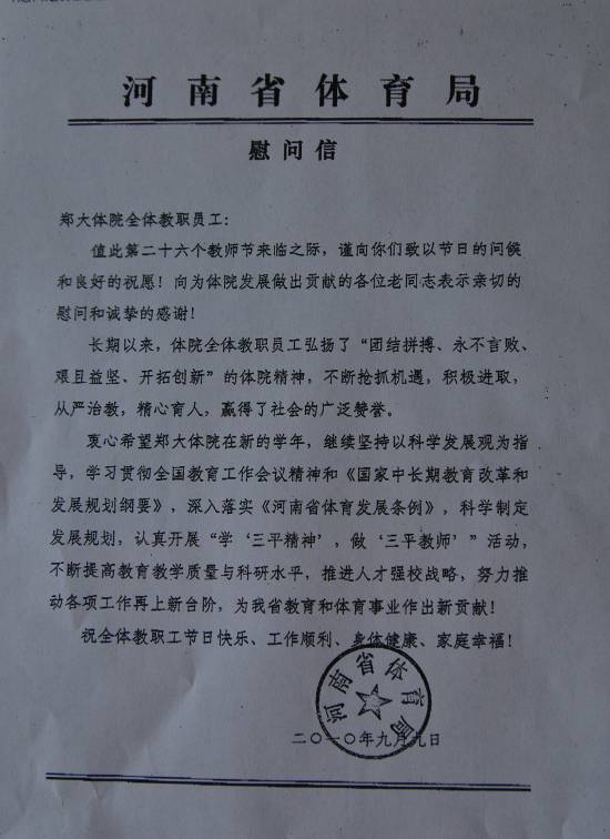 我院在省十一运会大学生组网球、健美操比赛中喜获佳绩 8月23日-28日,河南省第十一届运动会大学生组网球比赛在河南大学金明校区举行,共有河南大学、郑州大学、河南师范大学等28个本专科高校的近300名领队教练员、运动员参加。...
