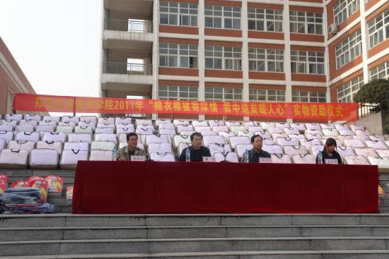 我院“棉衣棉被寄真情 雪中送炭暖人心”资助仪式隆重举行 12月1日,我院2011年“棉衣棉被寄真情 雪中送炭暖人心”资助仪式在综合楼广场举行。...