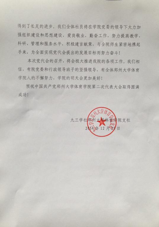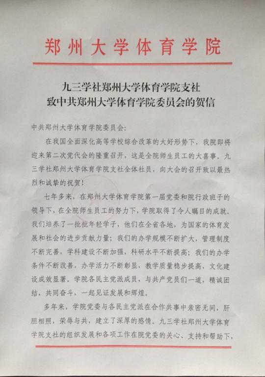 在我院第二次党代会召开前夕,院党委收到九三学社郑州大学体育学院支社贺信: