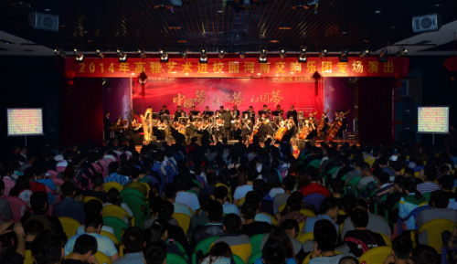4 月24 日 晚七点,由河南省教育厅、文化厅、财政厅牵头举办河南省交响乐团“2014年高雅艺术进校园活动”专场音乐会在我院大学生活动中心隆重举行。我院千余名师生到场聆听了音乐会,副院长张绍通在演出开始前致欢迎词。