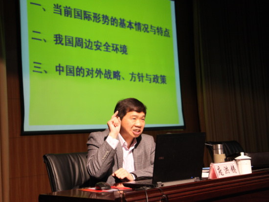庞洪铸教授的讲座以《当前的国际形势与我国周边国家安全环境》为题,从3个方面进行了讲述:一是当前国际形势的基本情况和与特点:和平与发展的主题未变,霸权主义和恐怖主义是两大威胁,国际形势总体和平、局部战争,总体缓和、局部紧张,总体稳定、局部动荡,经济全球化、世界政治多极化、国际关系民主化、发展模式多样化等多种潮流并现;二是我国周边安全环境:既有有利的国际因素,也面临着风险矛盾和问题;三是我国的对外战略、方针与政策。整场讲座语言通俗幽默,阐述全面系统,内容丰富多彩,分析透彻深刻,兼具了理论性、趣味性、故事性和严谨性,让与会师生享受了一道难得的理论学习大餐。