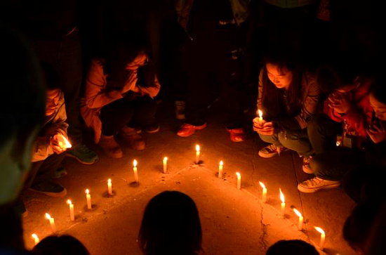 晚,校区学生自发组织了为雅安祈福的活动,在点燃蜡烛的广场上,全体人员默哀一分钟,之后大家一起高呼:“雅安加油!中国加油!”