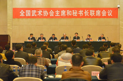 2 月27日 ,2013年全国武术协会主席和秘书长联席会议在天津举行。中国武术协会副主席、特邀副主席、秘书长、副秘书长,中国武术协会各一级单位会员协会的主席、秘书长,国家体育总局武术研究院专家委员会的专家等共100多人出席了会议。国家体育总局副局长肖天出席会议并为武术工作先进单位和个人颁奖。