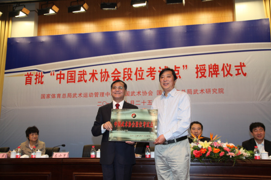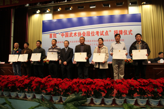 高小军主任向获得首批“中国武术协会段位考试点”的单位代表进行授牌;陈国荣副主任为获批单位代表颁发了中国武术协会段位考试点资证证书和注册证书;段位制办公室主任康戈武宣读了国家体育总局武术运动管理中心、中国武术协会《关于批准设立首批中国武术协会段位考试点的决定》。包括我院在内的323个单位获得了考试点资格证书和注册证书。