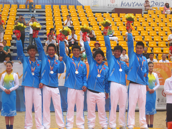 在22日结束的第三届亚洲沙滩运动会上,我院藤球教练张永斌率领以我院藤球队员杨家鹏、王刚、葛雨升、金杰、韩冬为班底的国家男子藤球队,在取得了团体第三名之后,继续发扬顽强拼搏的精神,在单组赛上接连战胜越南和印尼等东南亚劲旅,第一次杀入单组决赛,经过奋力拼搏,最终获得亚军,创造了中国男子藤球历史上最好成绩。