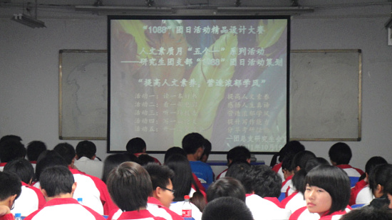 “1088”团日活动精品设计大赛是我院共青团工作的一项亮点工程,10月份为研究生团支部团日活动月。为全面提高学生的人文素质,营造浓厚学风,研究生团支部策划组织了“人文素质月五个一”系列活动。