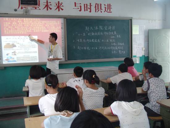 为激发广大中学生的爱国热情,引导他们关心国家时事政治,7月9日,我院大学生宣讲服务团走进郑州二十六中,为同学们讲解了国家“十一五”取得的辉煌成就和《中原经济区建设纲要》的主要内容。丰富的图片,鲜活的事例,台上台下积极互动,气氛异常热烈。