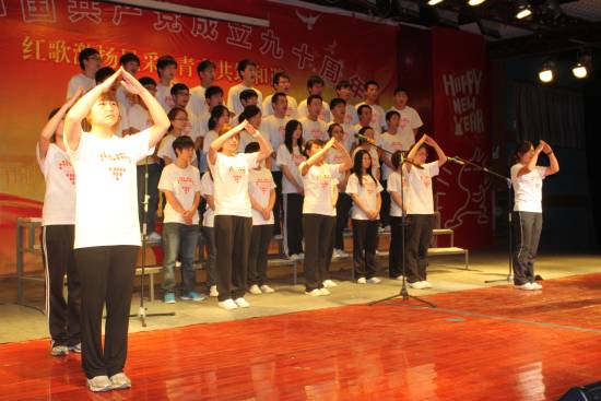 红,是燃烧的火焰;红,是沸腾的血液;红,是我们中华儿女对中国共产党最炙热的爱。在红色的大地上,在这流金岁月里,唱响具有民族特色的红歌,让我们的青春燃烧起来。运动训练系全体师生相信,在我们学院领导的正确领导下,运动训练系定能发扬“艰苦奋斗,拼搏创新”的精神,坚持科学发展,面对新的挑战,与时俱进,不断创新,为学院的宏伟蓝图贡献力量!