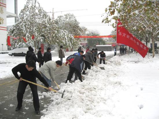 按照省委省政府《关于认真做好应对雪灾工作的紧急通知》要求,学院向广大师生发出了把积雪清理彻底的号召,我院教职工、各系团总支学生会、学生社团等千余人参加到扫雪中来,他们不顾严寒,争先恐后地挥着铁锨,拿着扫把,干得热火朝天,成为校园中一道亮丽的风景线。有的师生脸冻僵了,鞋子浸湿了,背上出汗了,可是他们没有一句怨言,愉快的欢笑声、擦擦的扫雪声、当当的铲雪声交融在一起,奏出了体院欢快和谐的交响曲。