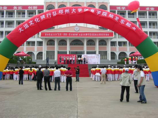 5月25日下午两点,2009“北京—深圳—贝尔格莱德”大运文化骑行活动郑州大学体育学院站发车仪式在我院登封校区举行,我院院长巫兰英、副院长张绍通、竞训处处长李南及登封校区全体师生参加了发车仪式。发车仪式上,巫院长代表学院致欢迎辞,深圳第二十六届世界大学生夏季运动会组委会执行局综合行政部部长刘平生先生致大运会邀请辞。在我院学生代表和骑行队员代表相继发言之后,双方交换校旗和大运会会旗并互赠纪念礼物。仪式结束后,巫院长鸣枪并宣布发车,在张院长的领骑之下,大运文化骑行队缓缓驶离校园,启程奔赴下一站——西安。