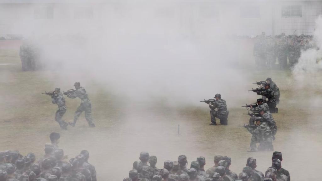 军训成果展示将典礼推向高潮,三大方队依次登场。先锋模范连在教官洪亮有力的口令下,队员们精准完成稍息、立正、停止间转法、齐步走、正步走等动作,队列整齐划一、步伐铿锵有力,尽显严明纪律与昂扬士气;格斗术方队出拳迅猛、踢腿有力,动作干脆利落、眼神坚定锐利,伴随着震天的呐喊声,将力量与气势展现得淋漓尽致,现场掌声此起彼伏;战术方队展示作为最受瞩目的环节,一颗烟雾弹划破长空后瞬间爆发出浓密白烟,将训练场笼罩在朦胧氛围中。电光火石间,队员们迅速低伏前进,战术翻滚如行云流水,化身“战场尖兵”——他们默契配合、交替掩护,每一个动作都精准到位、锋芒毕露,用热血与无畏诠释了我校学子“不畏艰难、勇往直前”的精神内核。