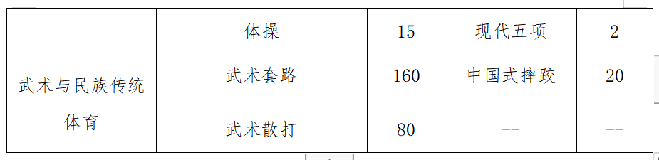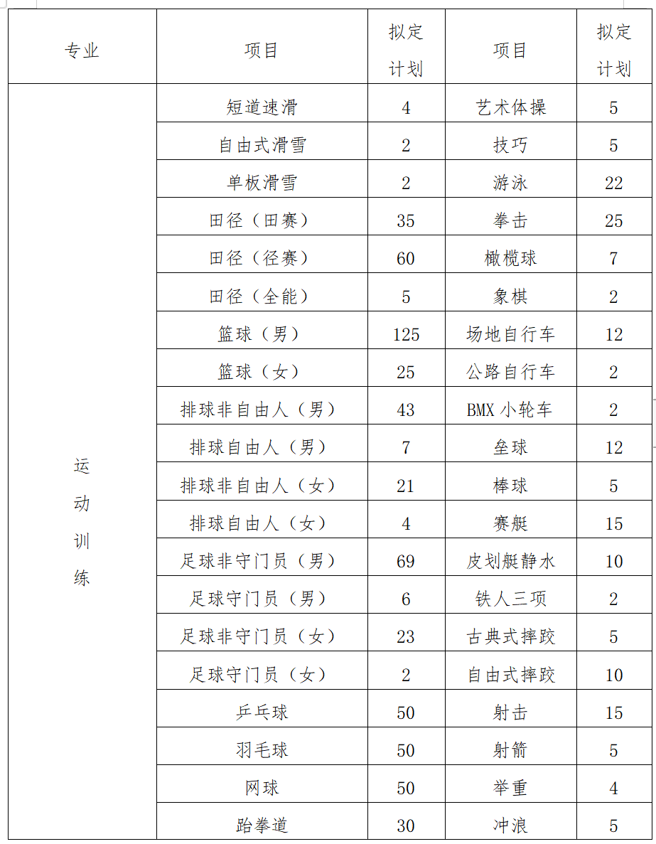 运动训练专业计划招生800人,武术与民族传统体育专业计划招生260人,招生计划不含保送录取优秀运动员。面向全国招生,不列分省计划。因场地和师资原因,运动训练专业部分项目限河南省专业运动队现役运动员报考(详见招生项目及报考要求第二条)。