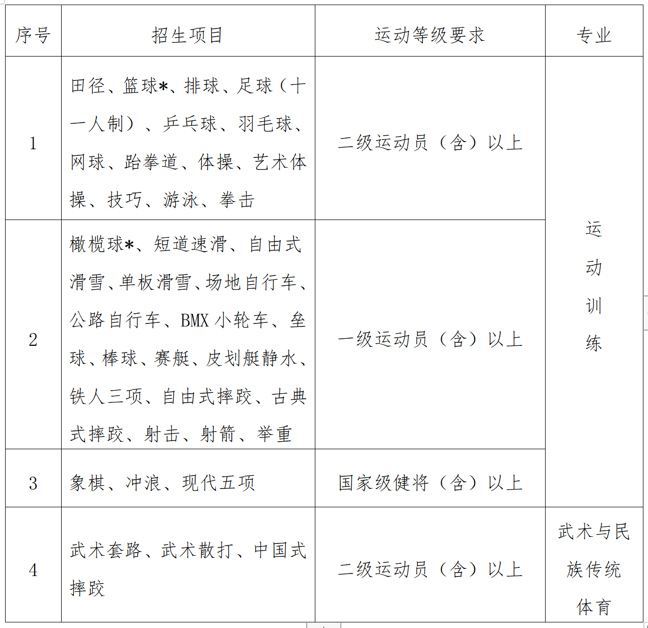 (一)招生项目与运动等级要求