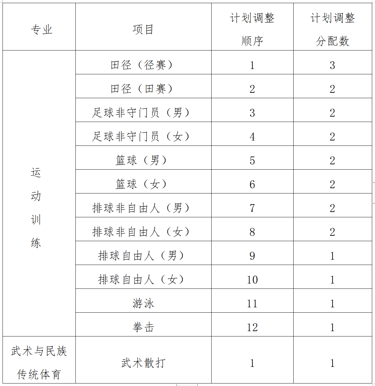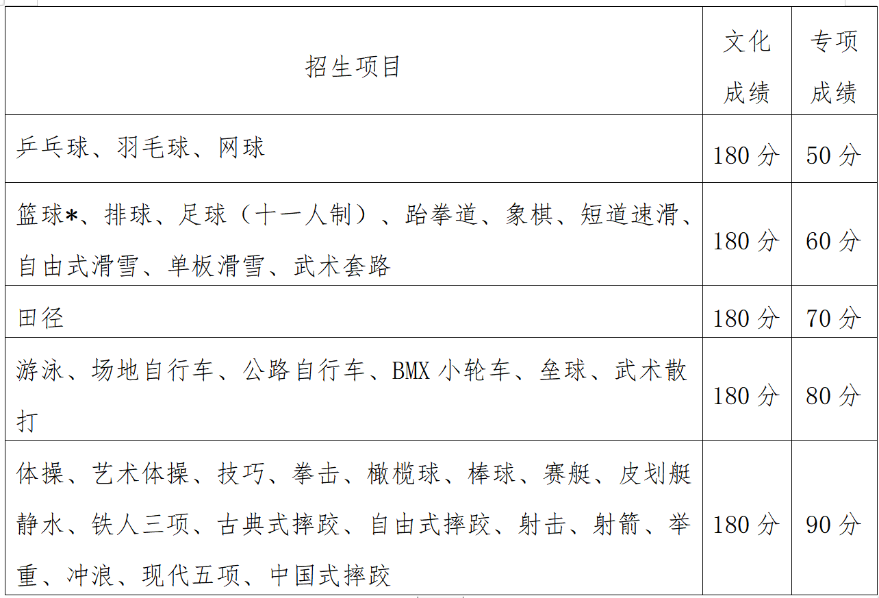 (四)我校采用按项目设置招生计划,其中田径项目按田赛、径赛、全能三类分别录取;排球项目按非自由人、自由人分别录取;足球项目按非守门员、守门员分别录取。足球、篮球、排球项目按男女分别录取。其他项目不分男女和小项录取。