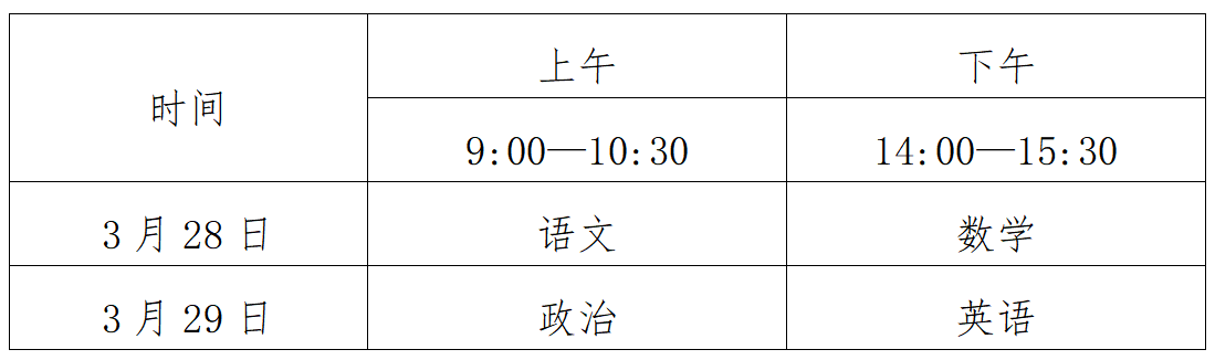 1.考试科目:语文、数学、政治、英语四科,每科满分150分,四科满分为600分,使用国家通用语言文字作答。所有考生必须参加普通高考报名所在省级招生考试机构组织的文化考试。考试时间为2026年3月28日至3月29日。考生于2026年3月21日12:00后登录“体育单招系统”打印文化考试准考证,依据准考证上的考点信息参加文化考试。