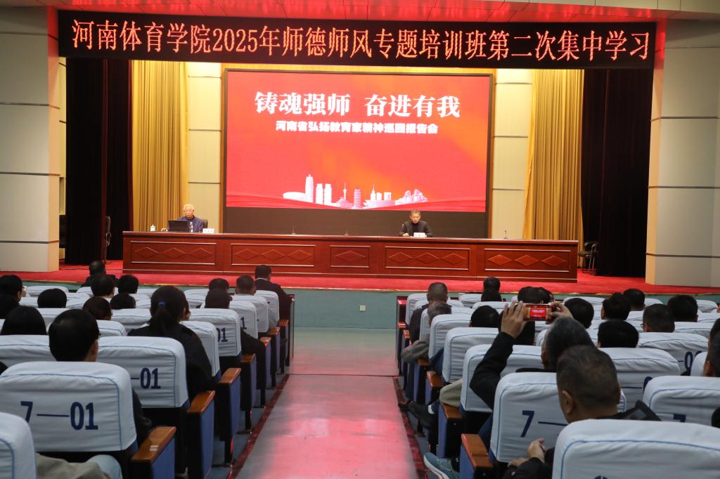 10月14日下午,河南体育学院2025年师德师风专题培训班第二次集中学习活动在学术报告厅举行,河南省教书育人楷模周建郑教授应邀做专题报告。校领导张大超和在郑班子成员与全体教职工参加了学习培训。