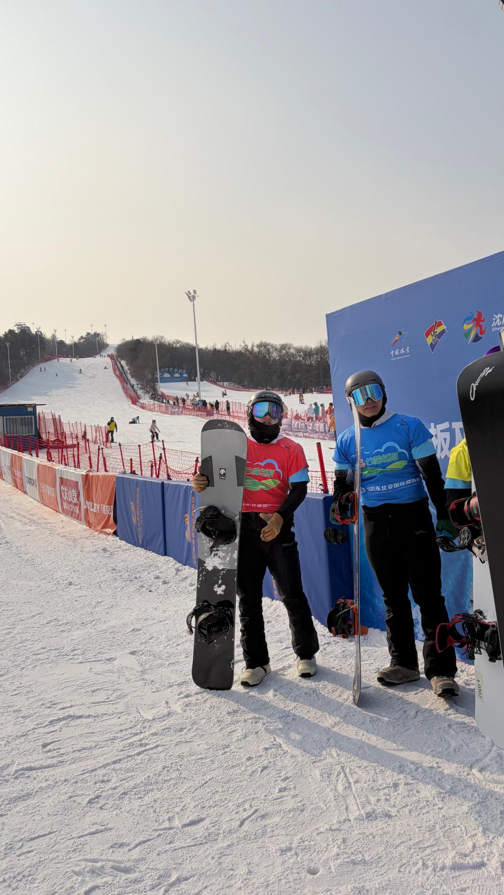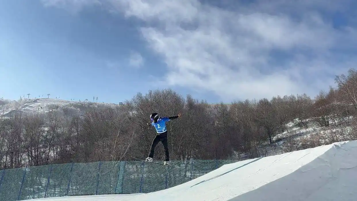 在零下十几摄氏度的沈阳东北亚滑雪场,23岁的河南小伙叶康佳从世界级赛道上飞驰而下,冲过终点,将全国单板滑雪障碍追逐锦标赛金牌收入囊中。